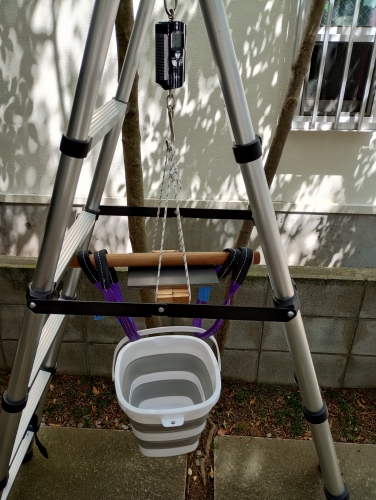 それで、下の写真のように脚立から吊るしたはかりにスプリングワッシャーを挟んだ鉄板をぶら下げて、バケツに水を入れて荷重をかけました。